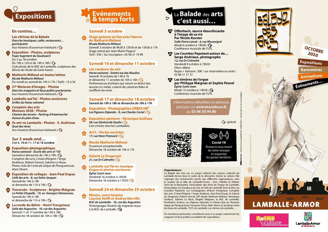 Dans le cadre des balades des arts, découvrez l'ensemble du programme des ateliers, conférences, expositions, et portes ouvertes d'ateliers mise en place sur le territoire de Lamballe!